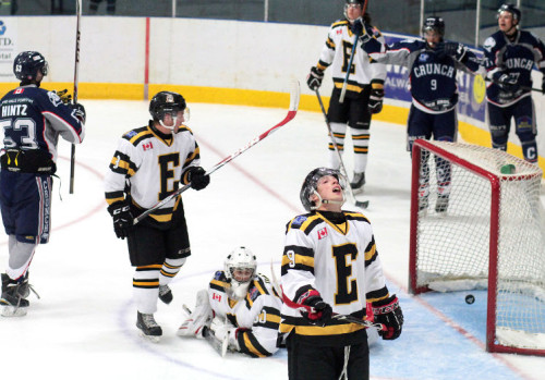 PHOTO: Cochrane Crunch scored 18 goals en route to a pair of wins over the Iroquois Falls Eskis to begin the 2015-2016 NOJHL season. (Photo by Timmins Daily Press.)