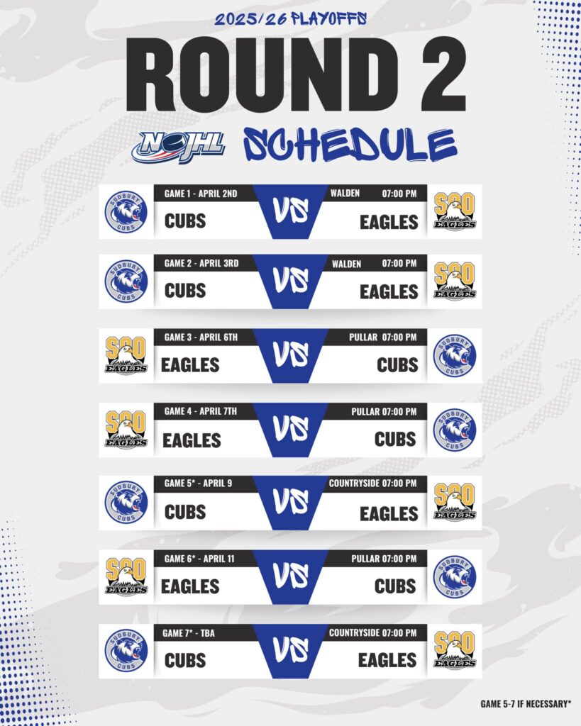 It will be the upstart no. 7 seed Soo Eagles against the no. 1 seed Sudbury Cubs in a best of seven, Northern Ontario Jr. Hockey League semi-final series. The Eagles stunned the no. 2 seed Powassan Voodoos in four straight games in the opening round while the Cubs did the same to the no. 8 seed Kirkland Lake Gold Miners.